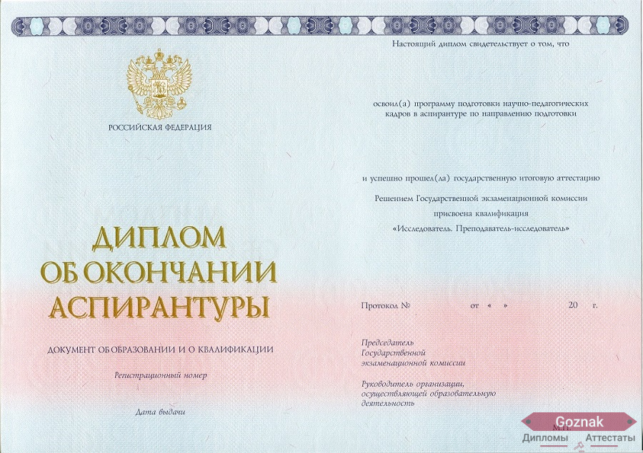 Компания «Гознак-Дипломы» успешно работает на рынке более 15 лет и предлагает Вам купить диплом аспирантуры 2014 - 2025 гг. выгодно по хорошим ценам на настоящем бланке Гознак с оригинальными печатями и подлинными подписями. Документы имеют все степени защиты, оформлены по государственным нормам и с учетом особенностей конкретных учебных заведений. Диплом аспирантуры 2014 - 2025 гг. на 100% соответствуют подлинникам, поэтому проблем точно не доставят, которые без опаски можно предоставлять в отдел кадров: