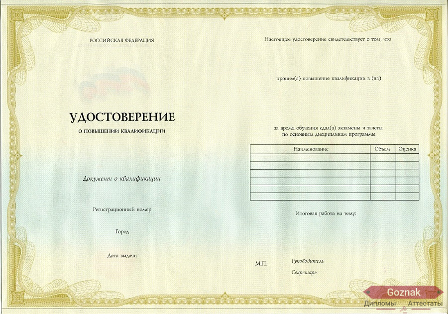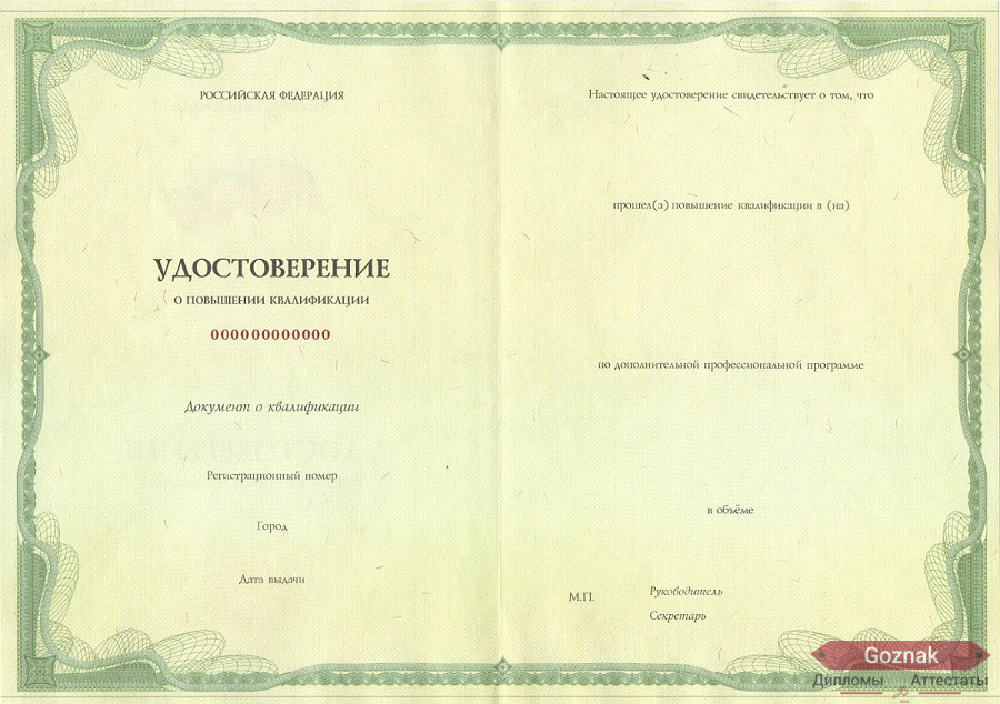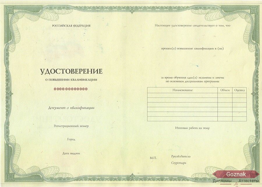 Компания «Гознак-Дипломы» успешно работает на рынке более 15 лет и предлагает Вам купить удостоверение о повышении квалификации 2013 - 2025 гг. выгодно по хорошим ценам на настоящем бланке Гознак с оригинальными печатями и подлинными подписями. Документы имеют все степени защиты, оформлены по государственным нормам и с учетом особенностей конкретных учебных заведений. Удостоверение о повышении квалификации 2013 - 2025 гг. на 100% соответствуют подлинникам, поэтому проблем точно не доставят, которые без опаски можно предоставлять в отдел кадров: